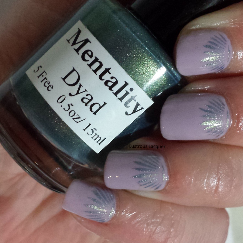 I started out with a layer of China Glaze Heaven and then free handed the "V" shape with Finger Paints Paper Mache. Once that was dry I taped off half of the "v" and used China Glaze Man Hunt to create the background for my stars. Which were also done with Paper Mache.